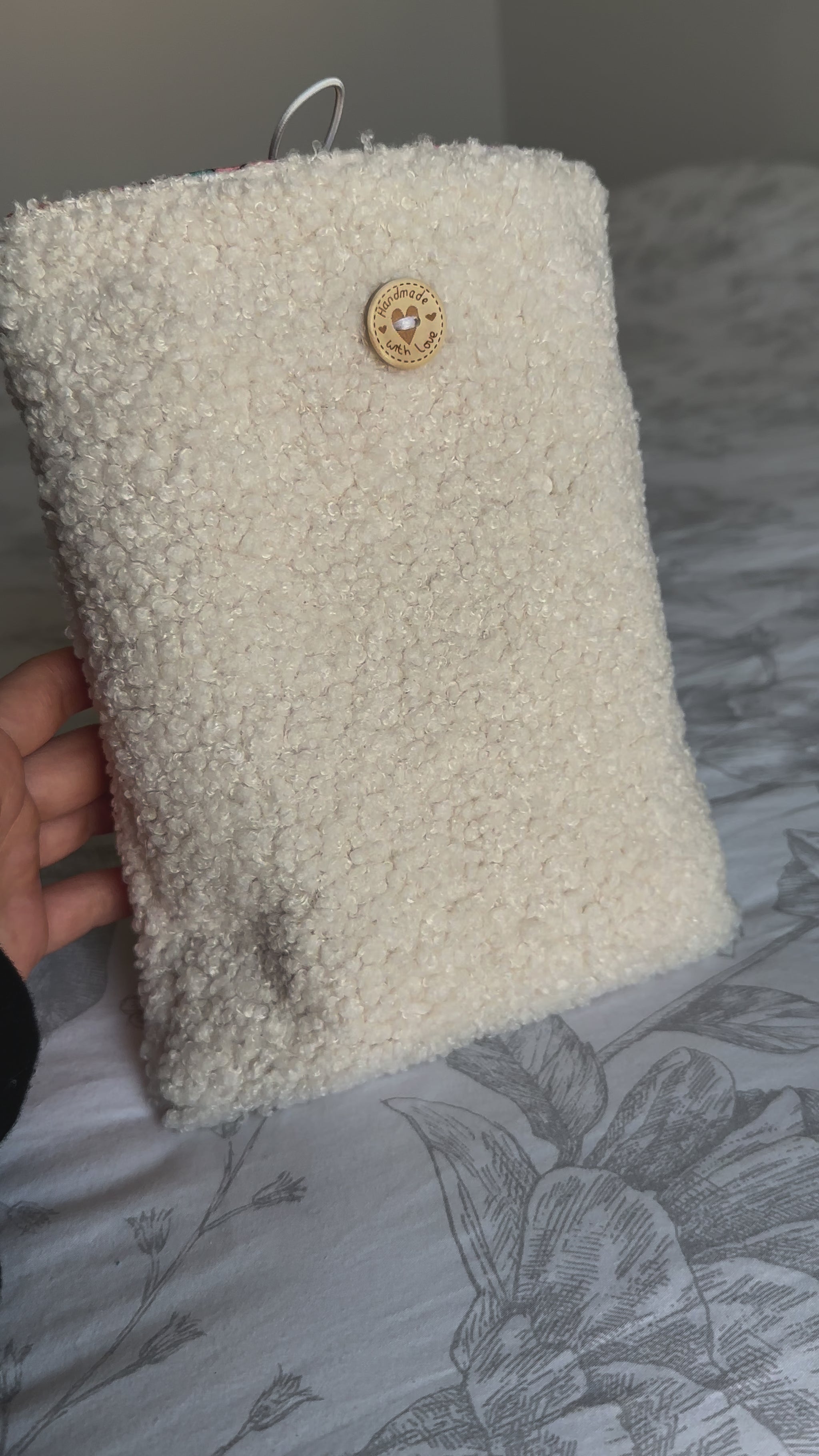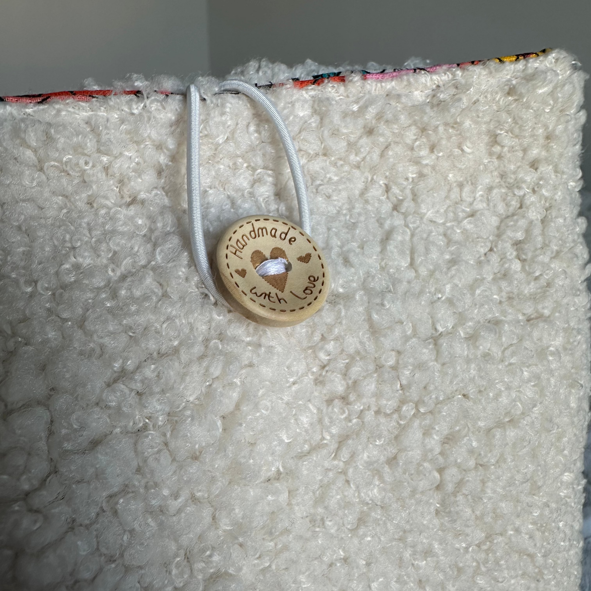 🏵️ Un bouton en bois est cousue sur la face avant de la pochette pour la fermeture.