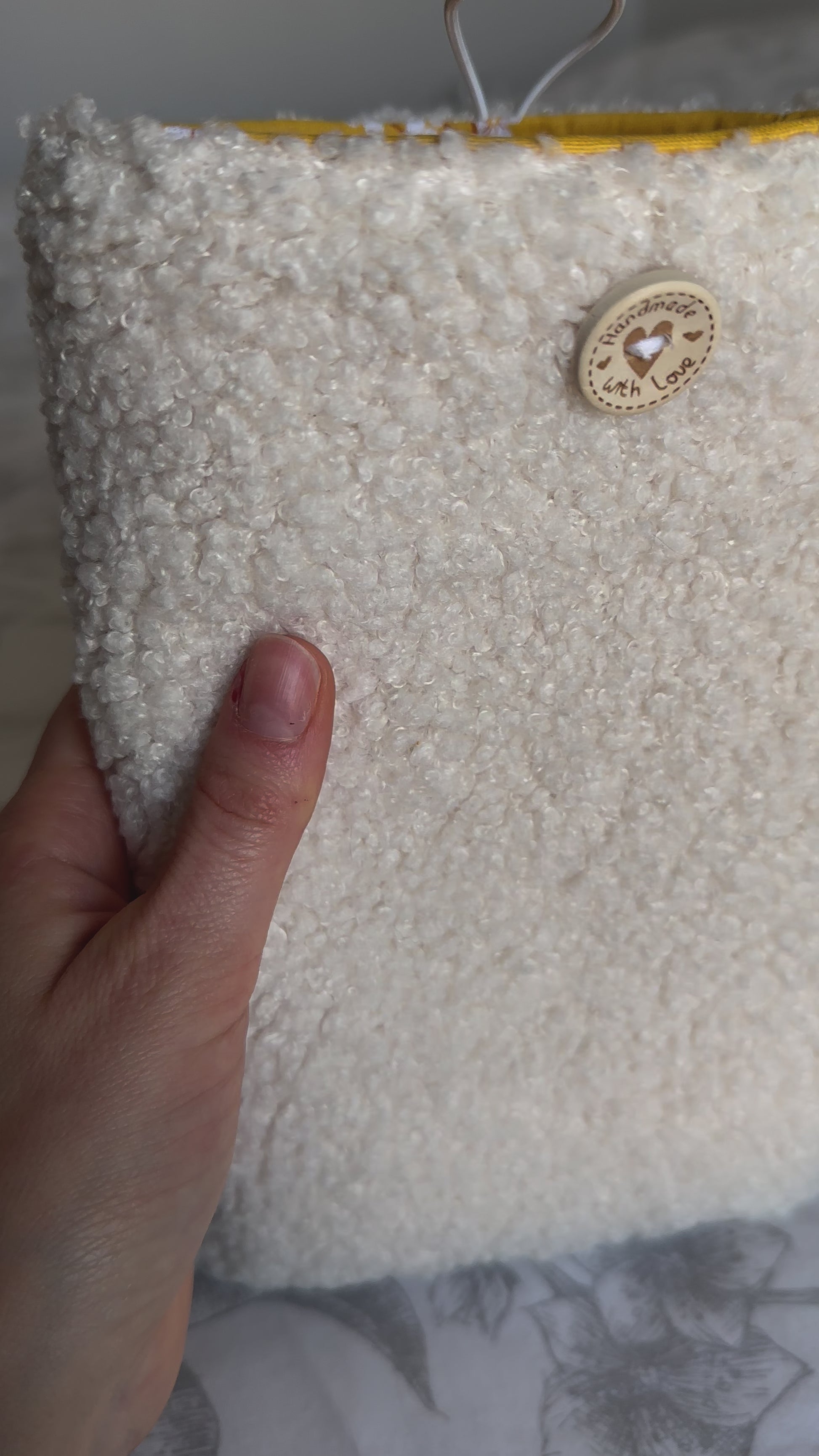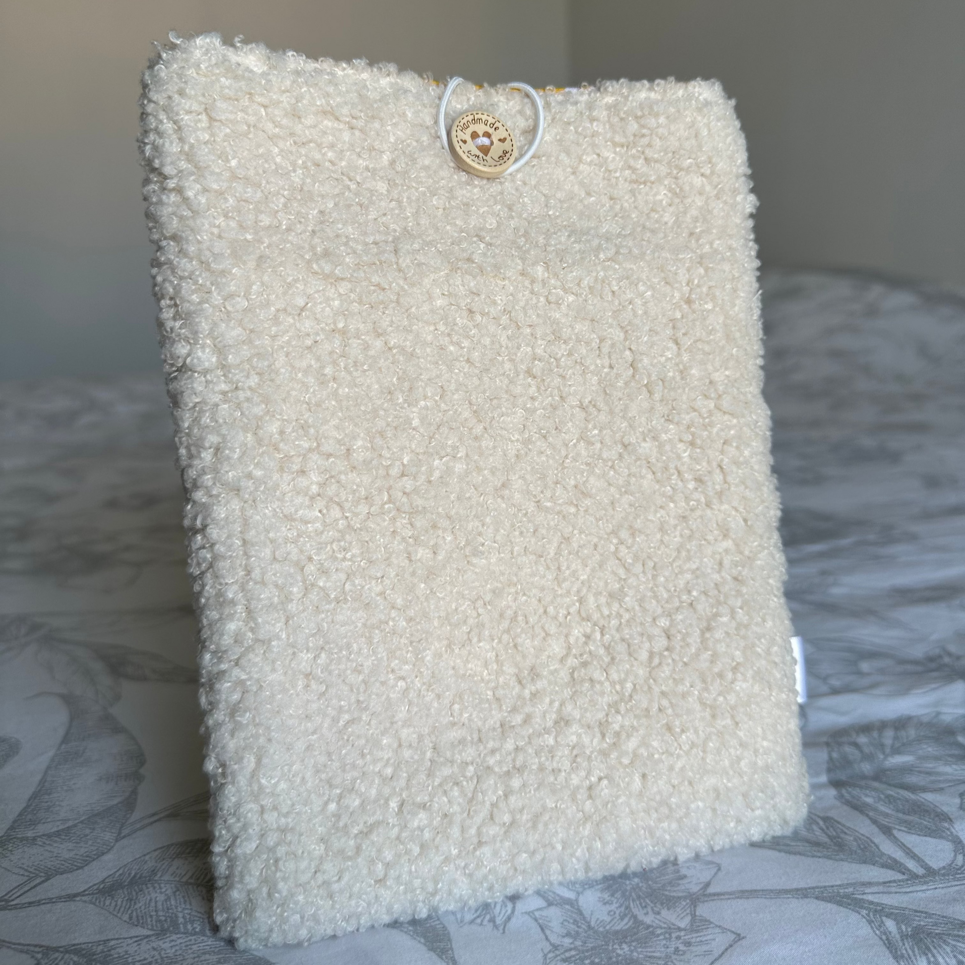 🏵️ Un bouton en bois est cousue sur la face avant de la pochette pour la fermeture.