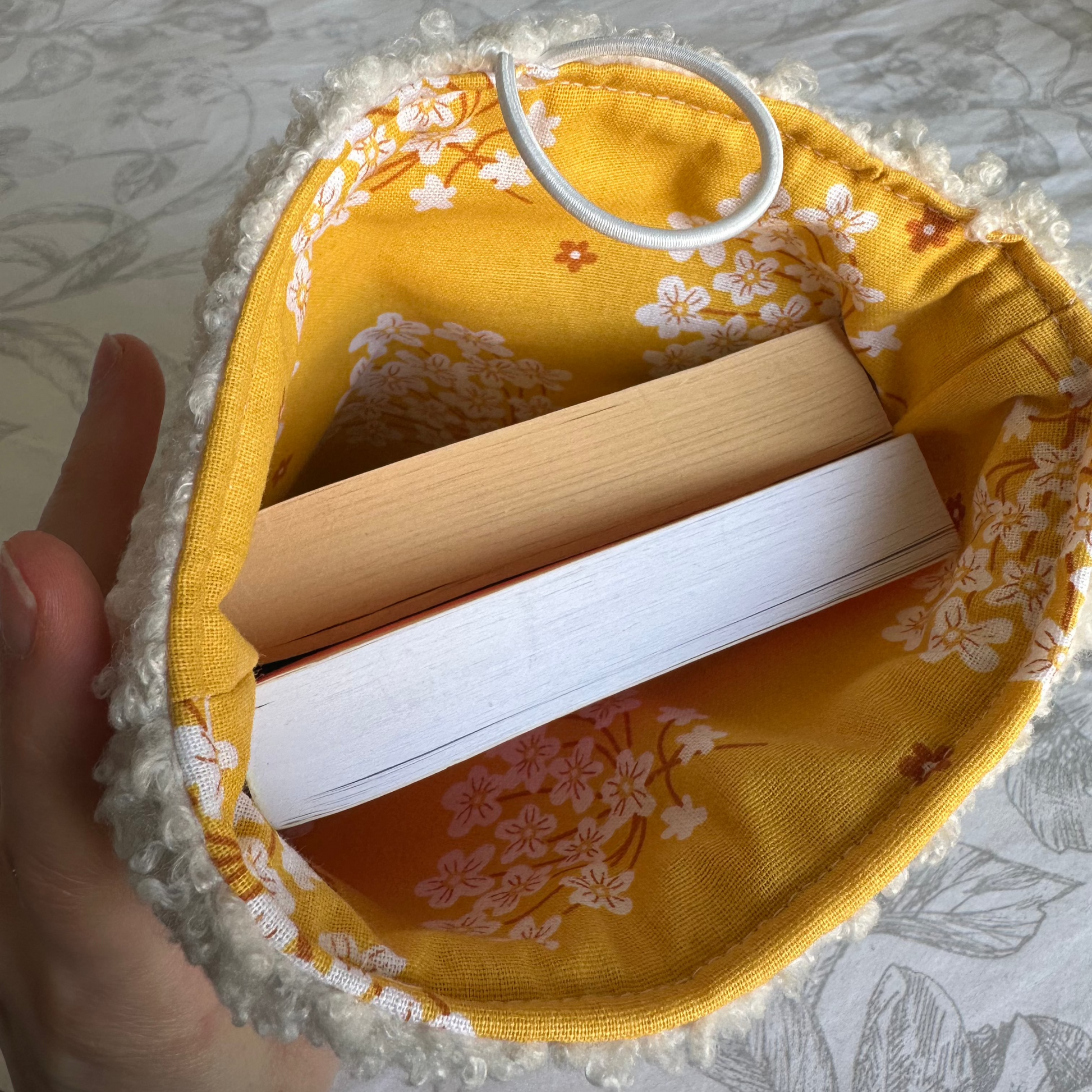 Tissu intérieur : cretonne jaune avec des fleurs blanches.