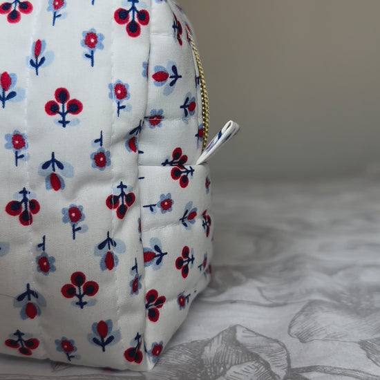 🎨 Couleur du tissu extérieur : cretonne blanc avec des motifs rouges et bleues.