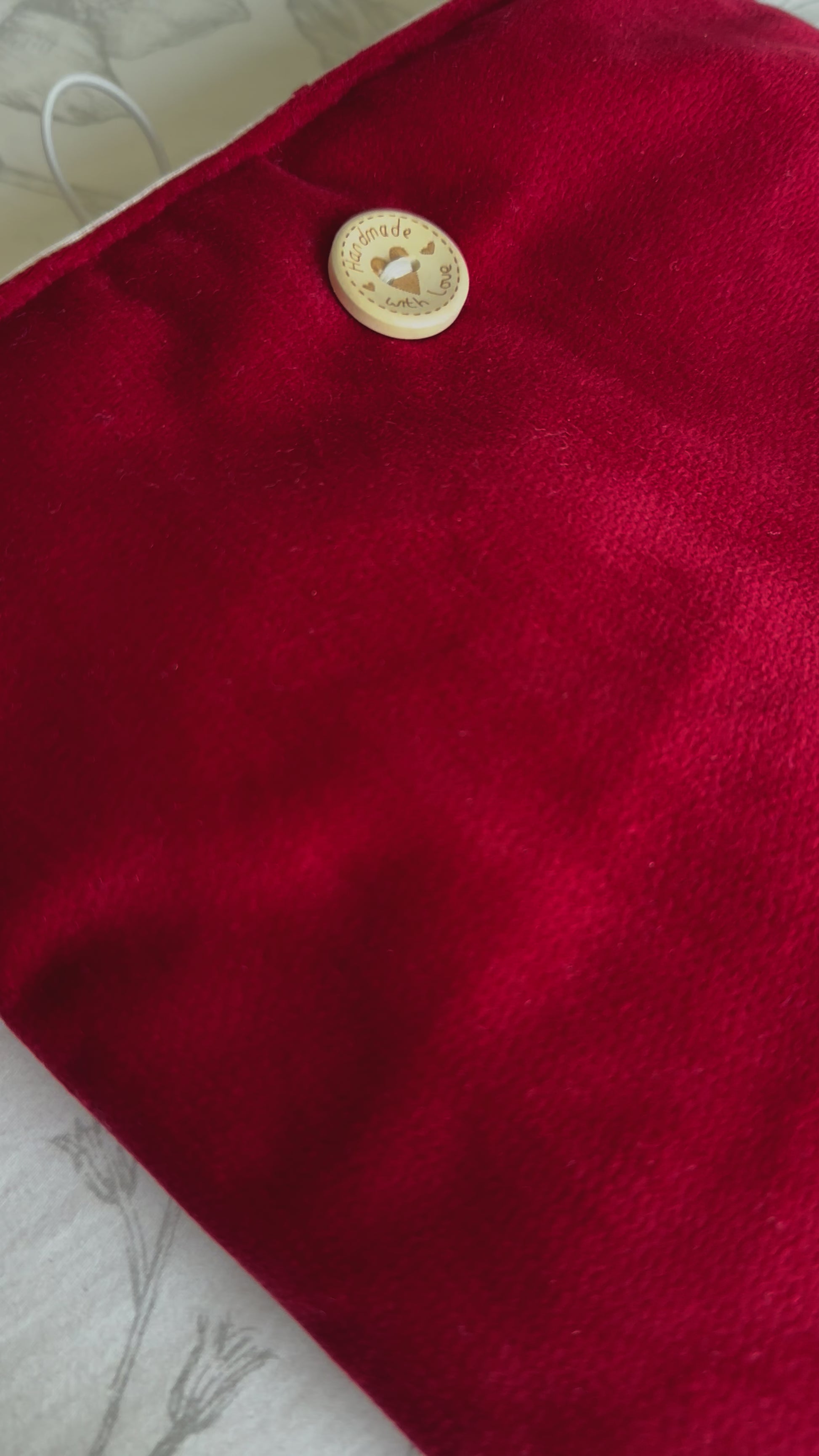 🏵️ Un bouton en bois est cousue sur la face avant de la pochette pour la fermeture.