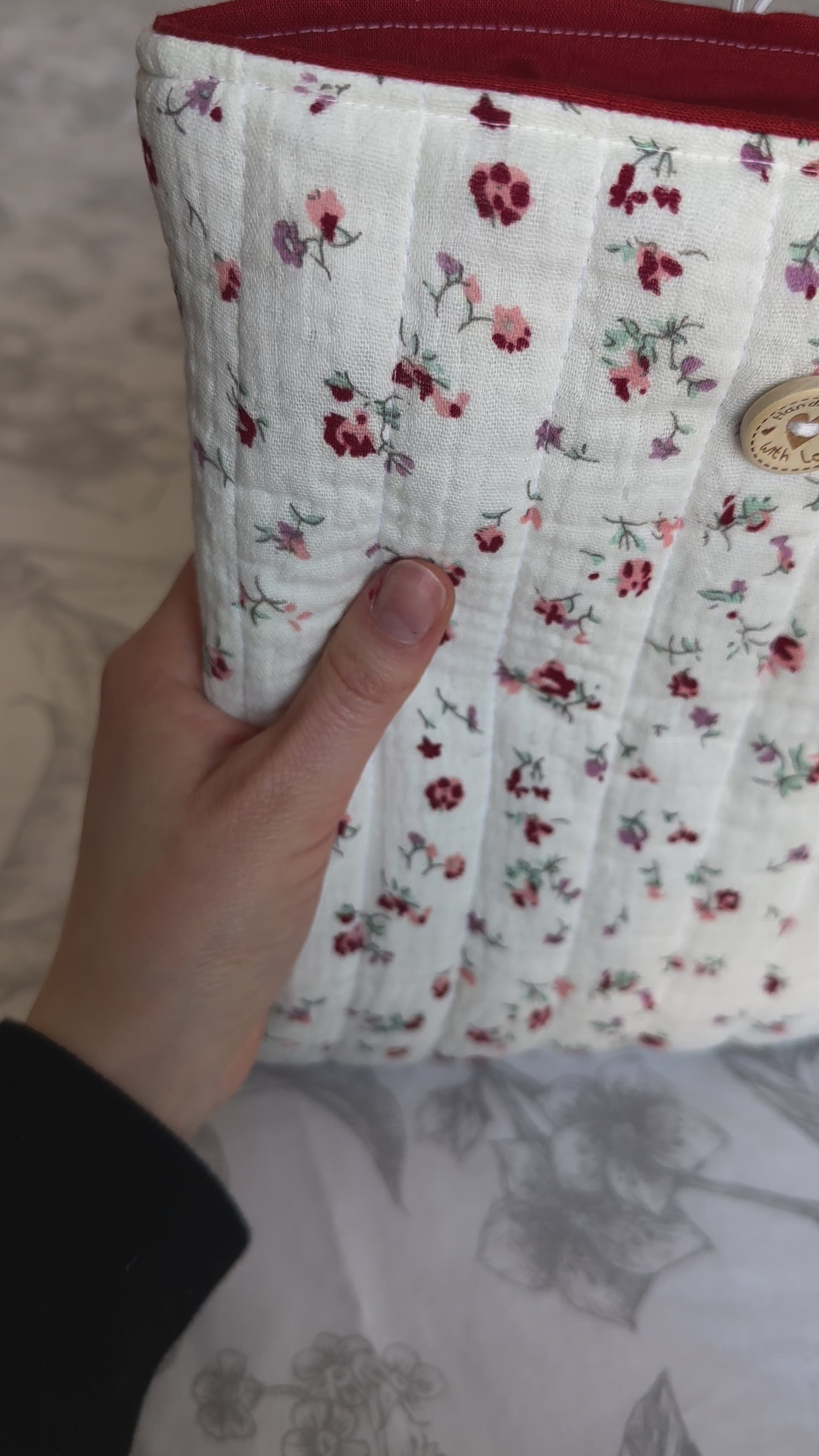 🏵️ Un bouton en bois est cousue sur la face avant de la pochette pour la fermeture.